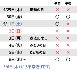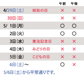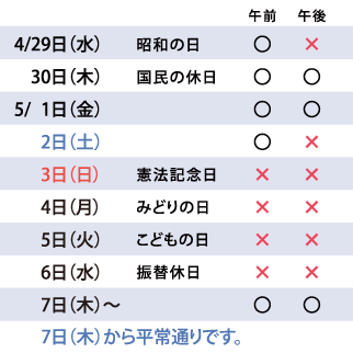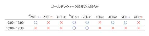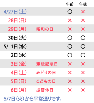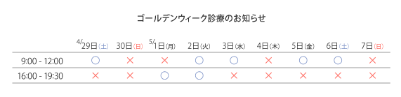 誠に申し訳ありませんがゴールデンウィーク中の診療時間は下記の通りとなります。 ご迷惑をおかけしますが、お間違えの無いようお願いいたします。
