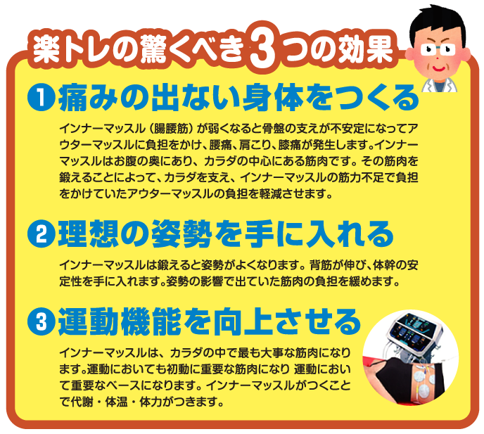当院おすすめの「楽トレ治療」。おかげさまで導入をして2年が経ちました。「長年苦しんだ痛みが取れた」、「姿勢が良くなった」、「生活活動が楽になった」、「ダイエット効果があった」など患者様の様々な声をお聞きしています。導入2周年を記念して日頃の感謝の気持ちと、もっと多くの方に知っていただこうと全ての方へ下記の期間中だけ「楽トレ治療」を無料で体験していただけます。