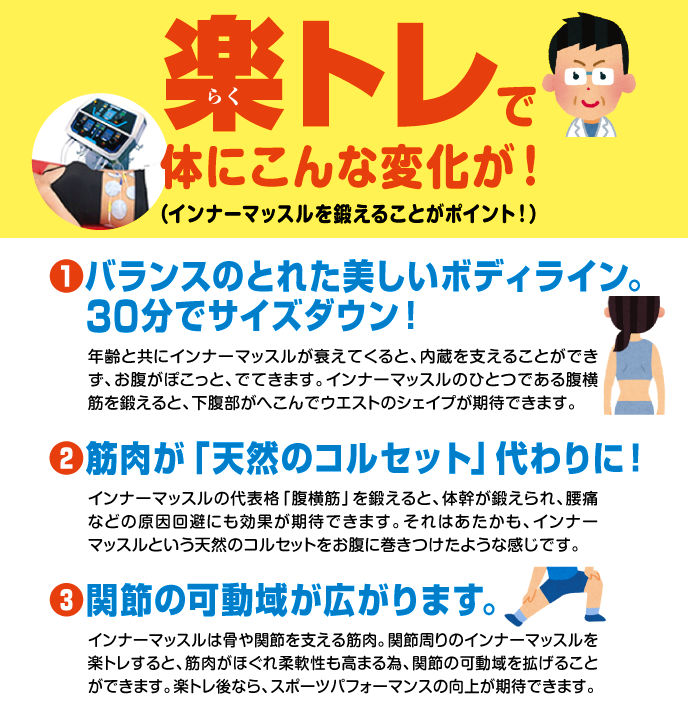 (体内にペースメーカーや金属のある方、妊娠中の方、医師に運動を禁止されている方、幼児の方はご使用できませんのでご了承ください)