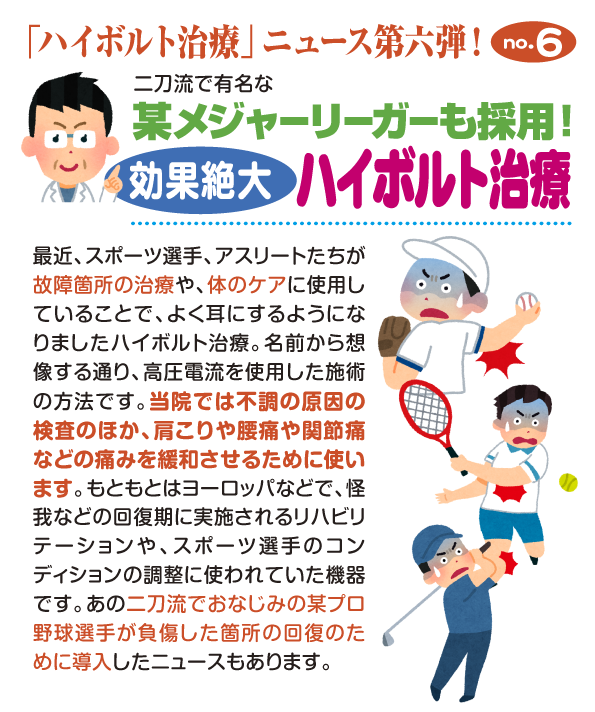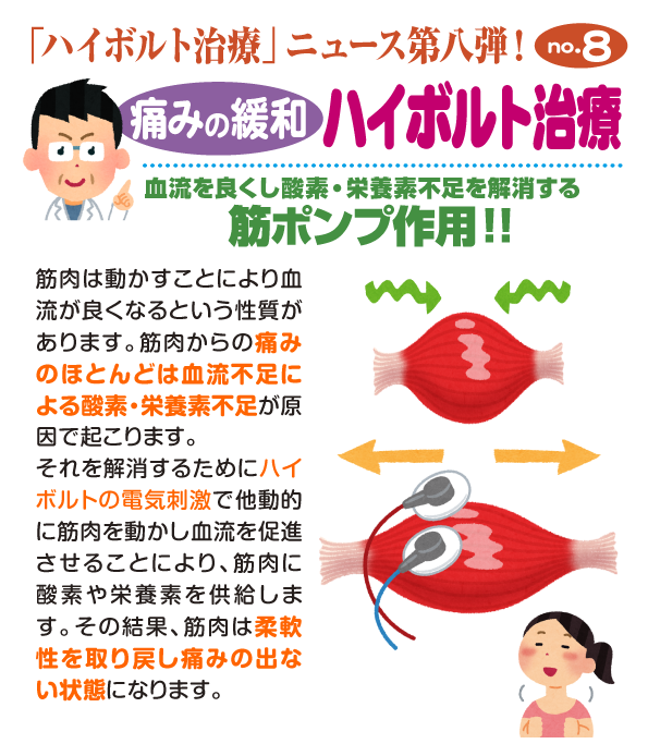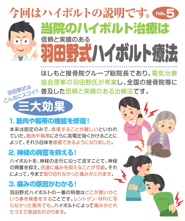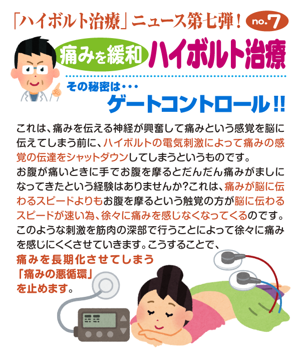ハイボルト治療を受けて痛みの軽減が長続きしないと言われる方がいらっしゃいますが、そういった方は身体を支えるインナーマッスルが低下していて、身体に負担がかかってしまっていると考えられます。ハイボルト治療は一時的にインナーマッスルに刺激を与え痛みを軽減するのですが、長続きしない方はインナーマッスルを根本的に鍛えて直さないといつまでも痛みと付き合っていかないといけません。当接骨院では、ハイボルト療法の他にインナーマッスルを鍛えることのできる治療もおこなっています。詳しくは 「当接骨院のおすすめ治療」をご覧いただき、いつでもお気軽にご相談ください。