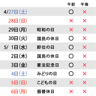誠に申し訳ありませんが診療時間は下記のとおりとなりますので、 ご不便をおかけしますが、お間違えの無いようお願いいたします。5/1(水)は営業となります。ご予約はお早めに!