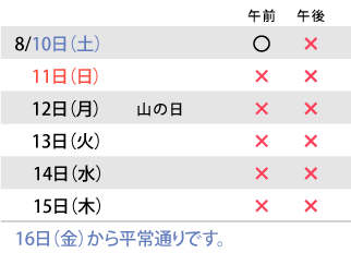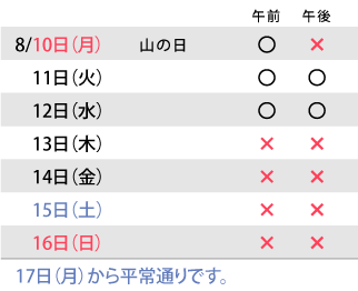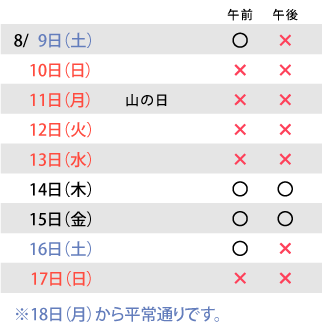 14日(月)から平常通りですが、 9日(水)、16日(水)は