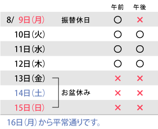 ・9日(祝日・月)9時~12時まで診療 午後休診