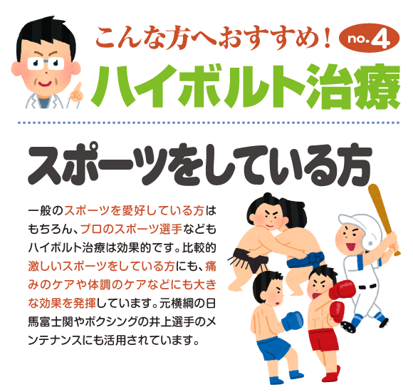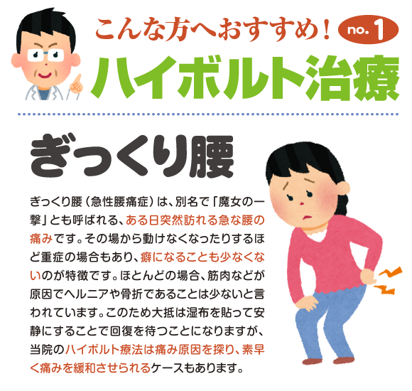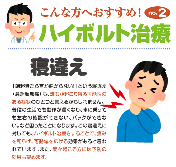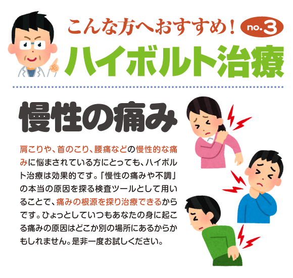 ハイボルト治療を受けて痛みの軽減が長続きしないと言われる方がいらっしゃいますが、そういった方は身体を支えるインナーマッスルが低下していて、身体に負担がかかってしまっていると考えられます。ハイボルト治療は一時的にインナーマッスルに刺激を与え痛みを軽減するのですが、長続きしない方はインナーマッスルを根本的に鍛えて直さないといつまでも痛みと付き合っていかないといけません。当接骨院では、ハイボルト療法の他にインナーマッスルを鍛えることのできる治療もおこなっています。詳しくは 「当接骨院のおすすめ治療」をご覧いただき、いつでもお気軽にご相談ください。