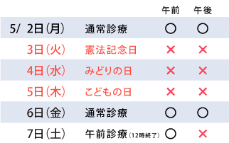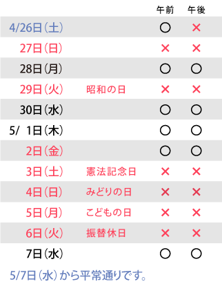 誠に申し訳ありませんがゴールデンウィーク中の診療時間は下記の通りとなります。 ご迷惑をおかけしますが、お間違えの無いようお願いいたします。