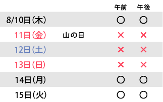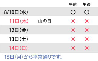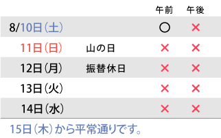 14日(月)から平常通りですが、 9日(水)、16日(水)は